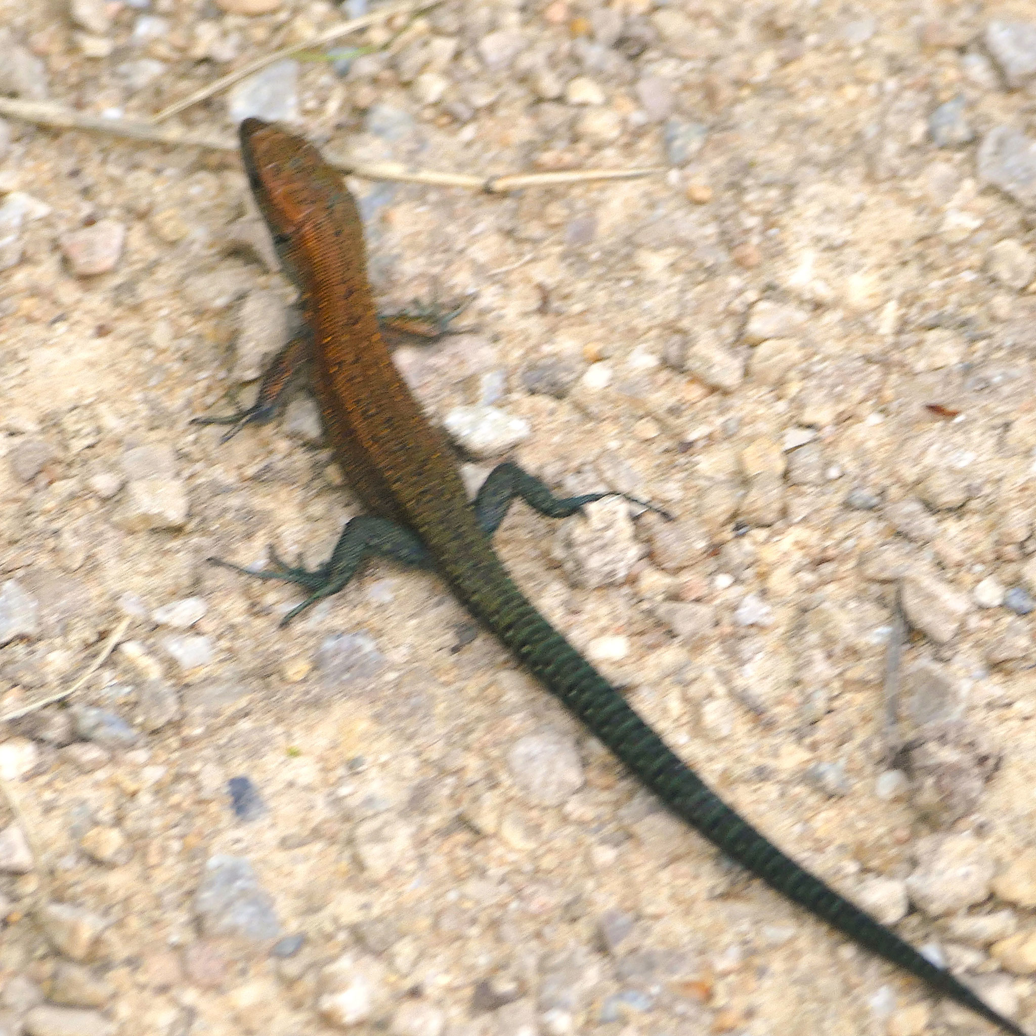 Stolz waren meine Ehefrau und ich am Wesel-Datteln-Kanal zwischen Ahsen und Marina Flaesheim, als eine kleine Eidechse zügig über den Kanalrandweg eilte, mir aber immerhin zwei Fotos erlaubte. Nach Rücksprache mit unserem Sprecher Dr. Andreas Breuckmann konnten wir die Art bestimmen, es war eine Waldeidechse.