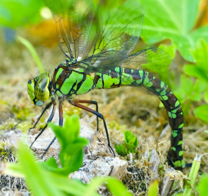 Die große Edellibelle flog suchend um den Teich, prüfte verschiedene wassernahe Rasenflächen und entschied sich dann am Teichrand für eine Stelle mit Moos. Sie landete und legte zielstrebig ihre Eier im Moos ab, flog dann einen Meter weiter und wiederholte die Eiablage. Dann wurden zwei Ehrenrunden geflogen und der Teich verlassen (die Eier der Libelle wurden wassernah abgelegt, um bei Regen in den Teich zu gelangen. Dort erfolgt dann die jahrelange Entwicklung der Larve, die sich später einmal in eine bildhübsche Libelle verwandeln wird, so die Fachliteratur). Ich freue mich jetzt schon auf den Tag, an dem ich hoffentlich sehen kann, wie die Larven aus dem Wasser klettern, um die Umwandlung in eine Libelle - die sog. Metamorphose - zu vollziehen.