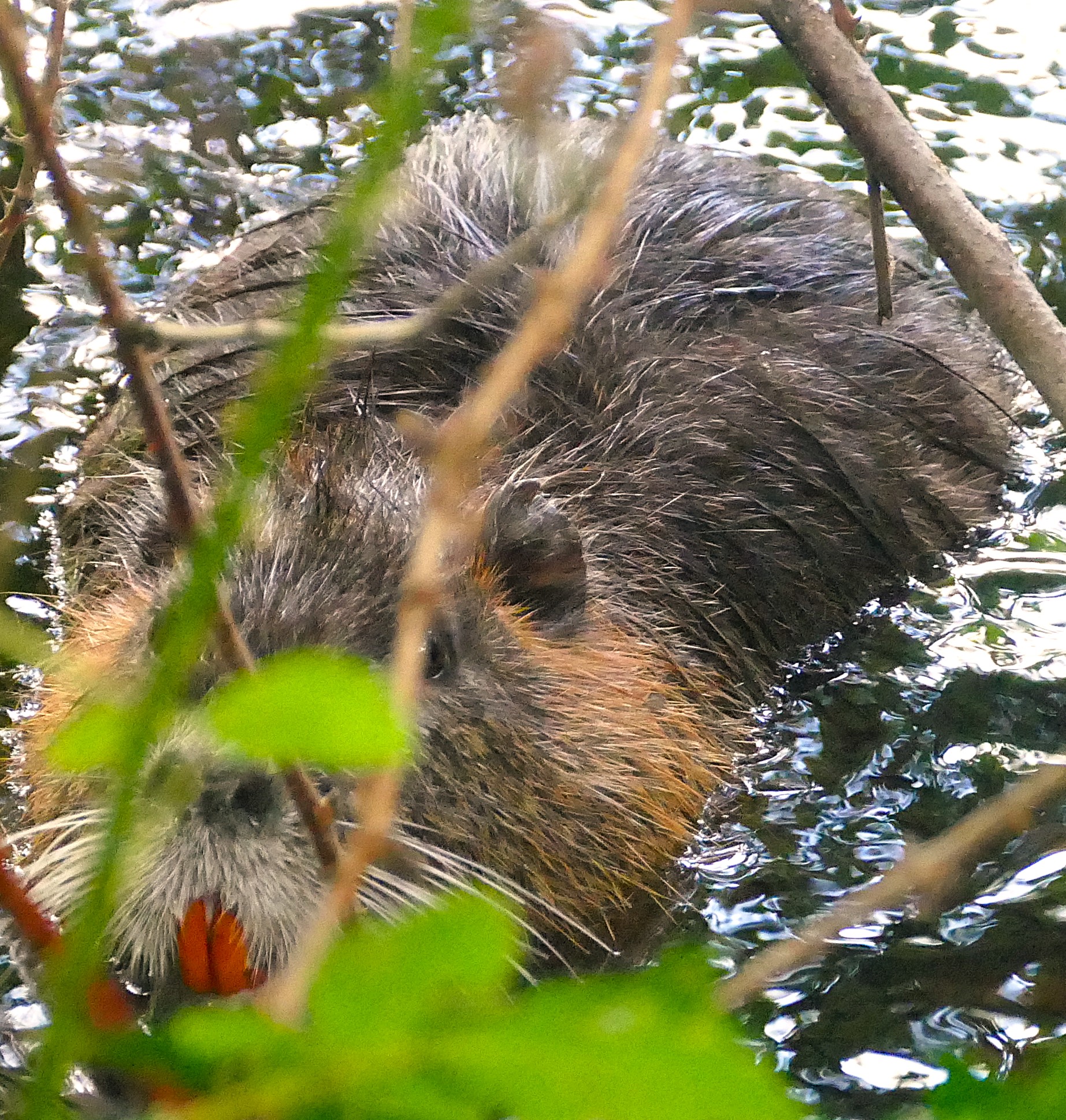 Mein persönlicher Liebling ist ein wohlgenährter Nager, eine Nutria. Er lag völlig entspannt auf einem Baum, der in den Teich gefallen war, und ihm waren die Spaziergänger und auch ich als Fotograf völlig Schnuppe. Leicht blinzeln und weiterschlafen. Markant sind u.a. die rotgefärbten Zähne, die sich aufgrund von Eisenablagerungen im Gebiss eben rötlich färben.
