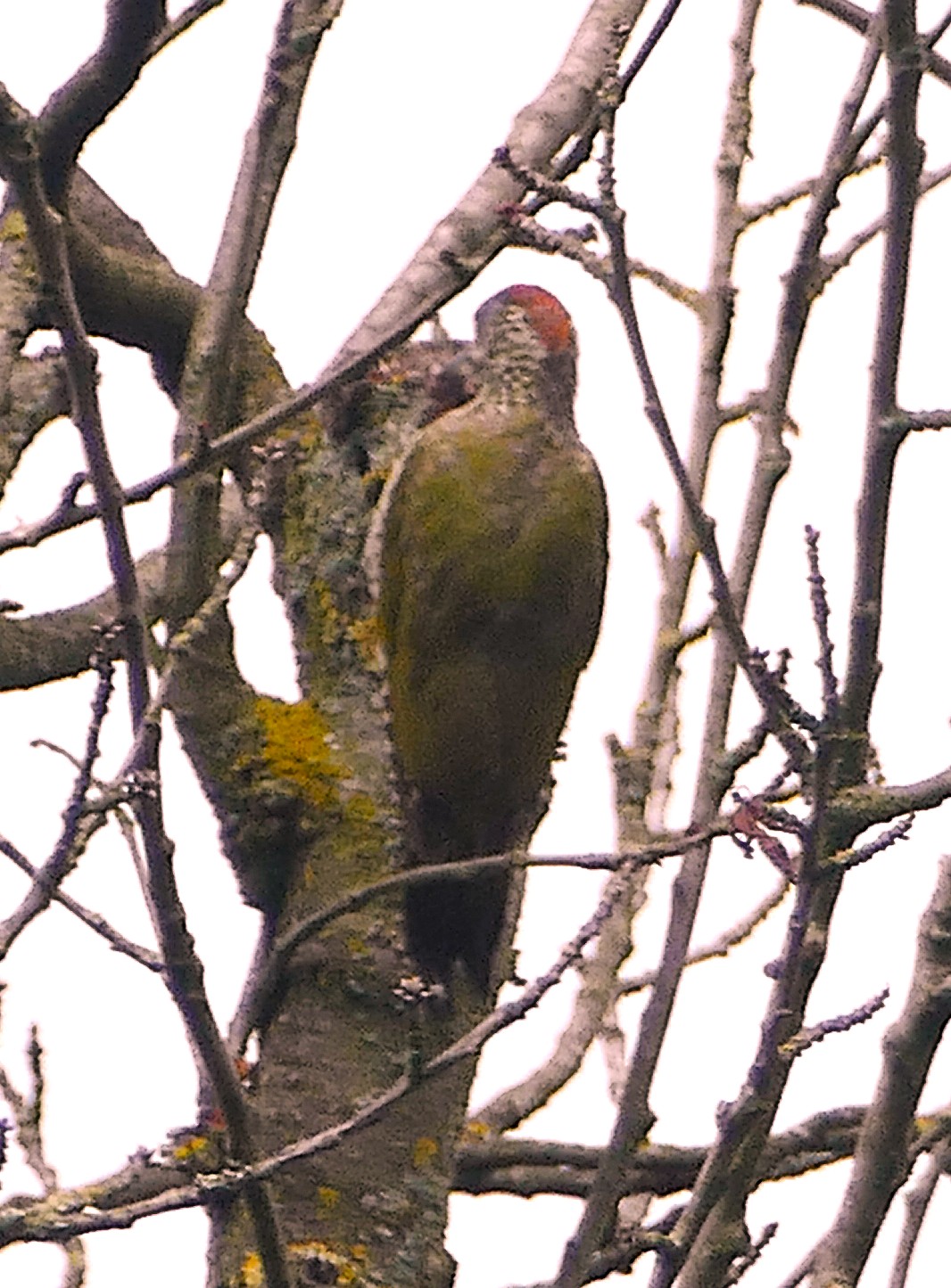 Von unserem Garten aus sehen wir unter anderem einen alten Baum, der offensichtlich im Spätherbst seiner Karriere steht. Er dient Tauben, Singvögeln und Krähen als Nachtquartier, aber auch der Grünspecht klettert dort herum und gönnte mir abends den Blick auf seinen Rücken. Ob er allerdings dort eine Baumhöhle als Quartier erwählt hat, konnte ich bisher noch nicht sehen.